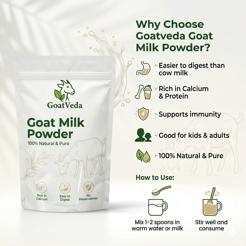 GoatVeda Goat Milk Powder is made from fresh, high-quality goat milk, carefully processed to retain maximum nutrition.